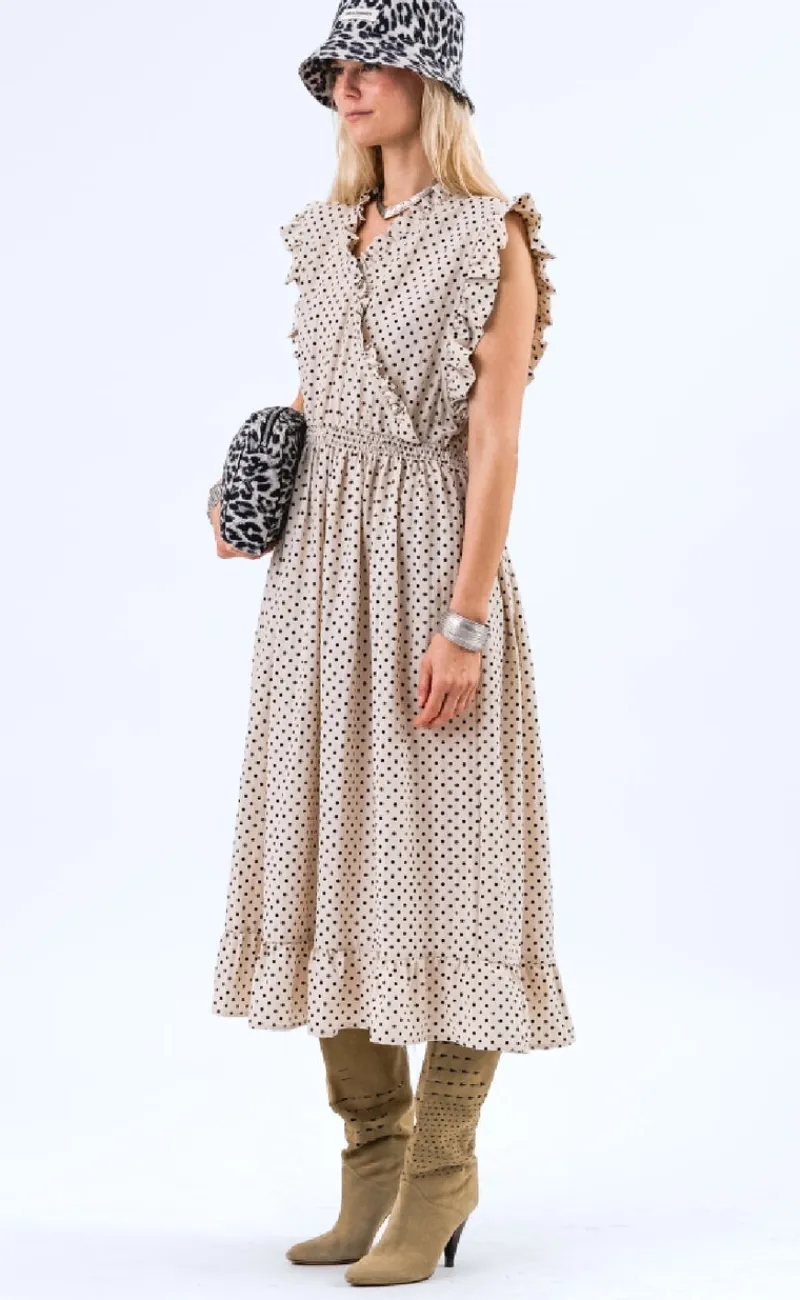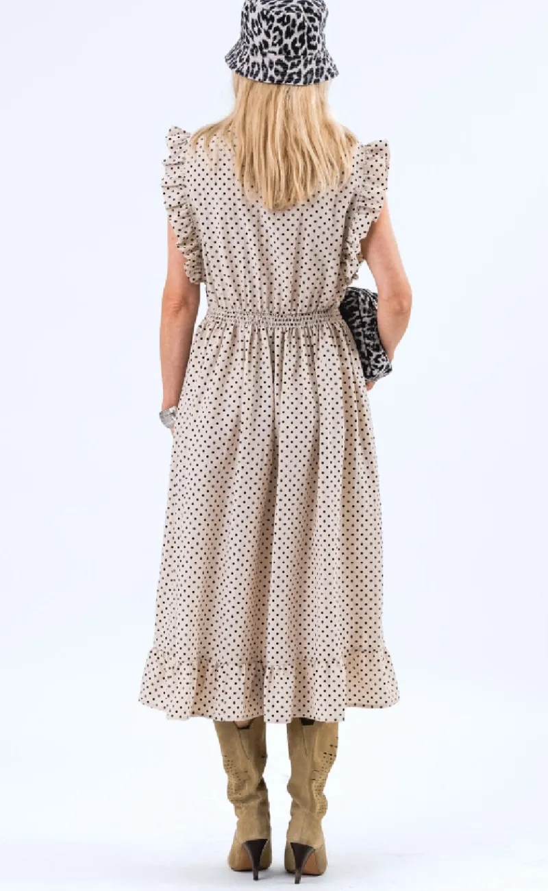 Midi kjole fra Lollys Laundry i en creme farve med sorte prikker.