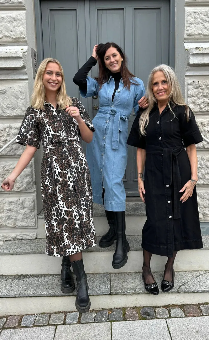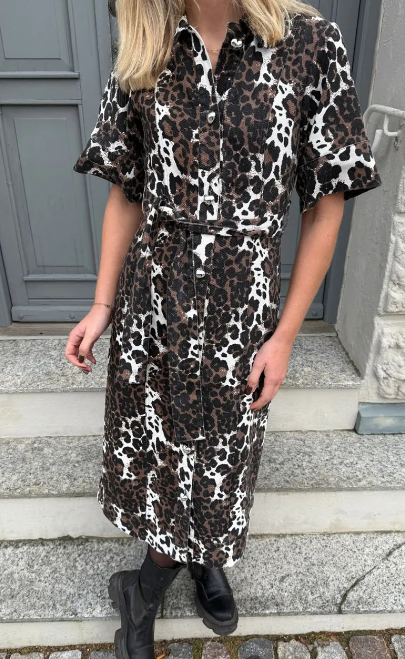 Kjolen er lang, har korte ærmer og kan bindes i taljen.