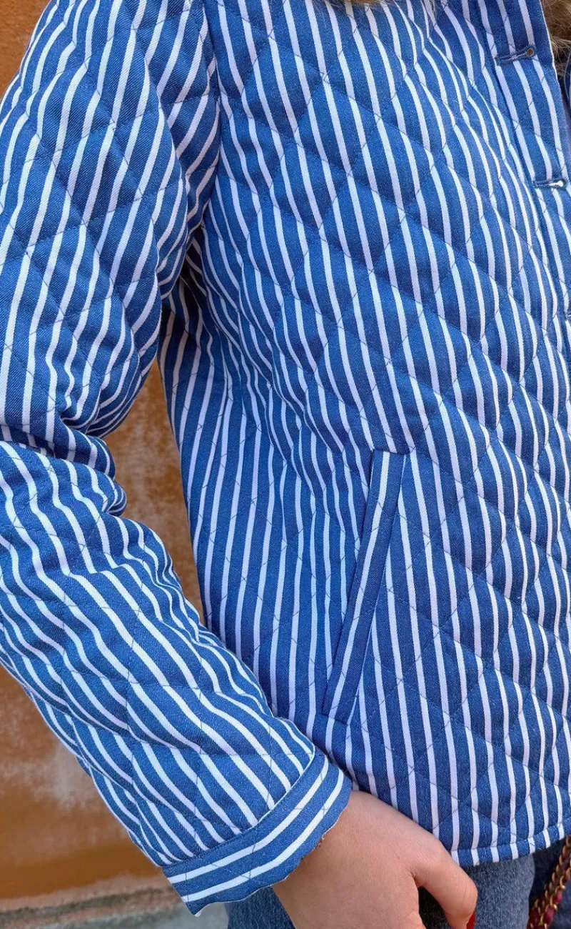 Smart jakke fra INA Copenhagen i blå- og hvidstribet quilt.