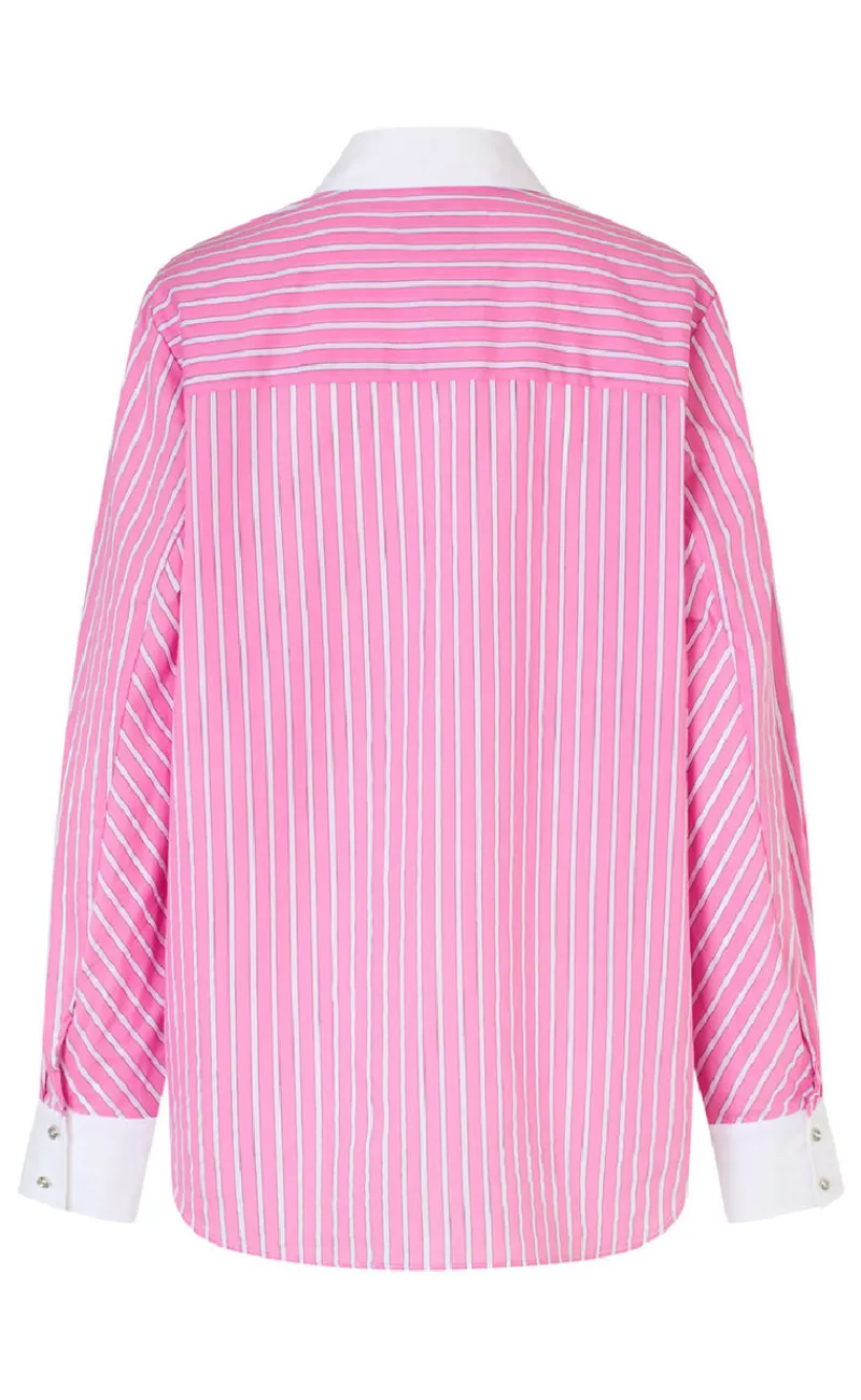 Cool pink stribet skjorte med afslappet pasform, hvid kontrast på manchetter, krave og knapliste. Skjorten har knapper foran, så du kan vælge at bære den åben eller lukket.