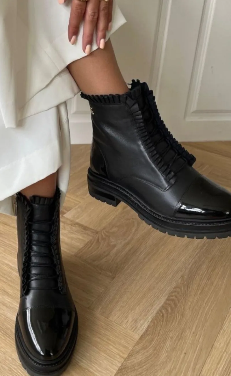 Cool støvler fra Copenhagen Shoes i sort med snørebånd, med en fin flæsekant.