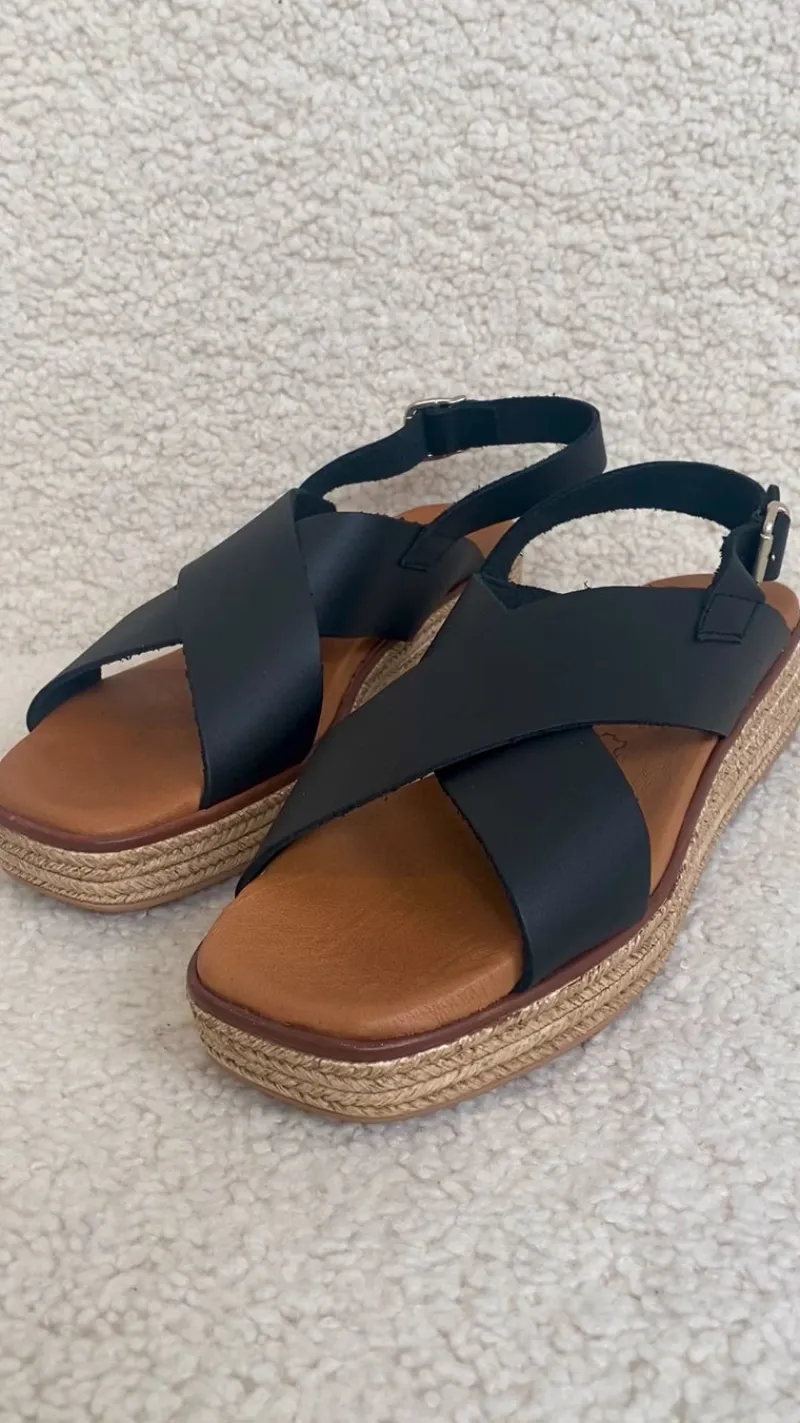 Sandalen har en smart krydsrem over forfoden, og om anklen som er justerbar. Sandalen har en rundet snude, en behagelig hæl og en blød gummisål i memory skum, så de er virkelig gode og behagelige at gå i.