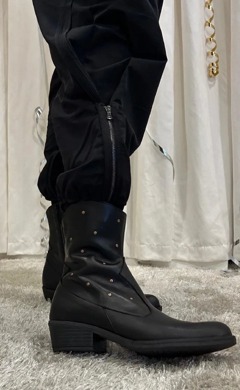 Støvle har nitter, lynlås og gummi sål.