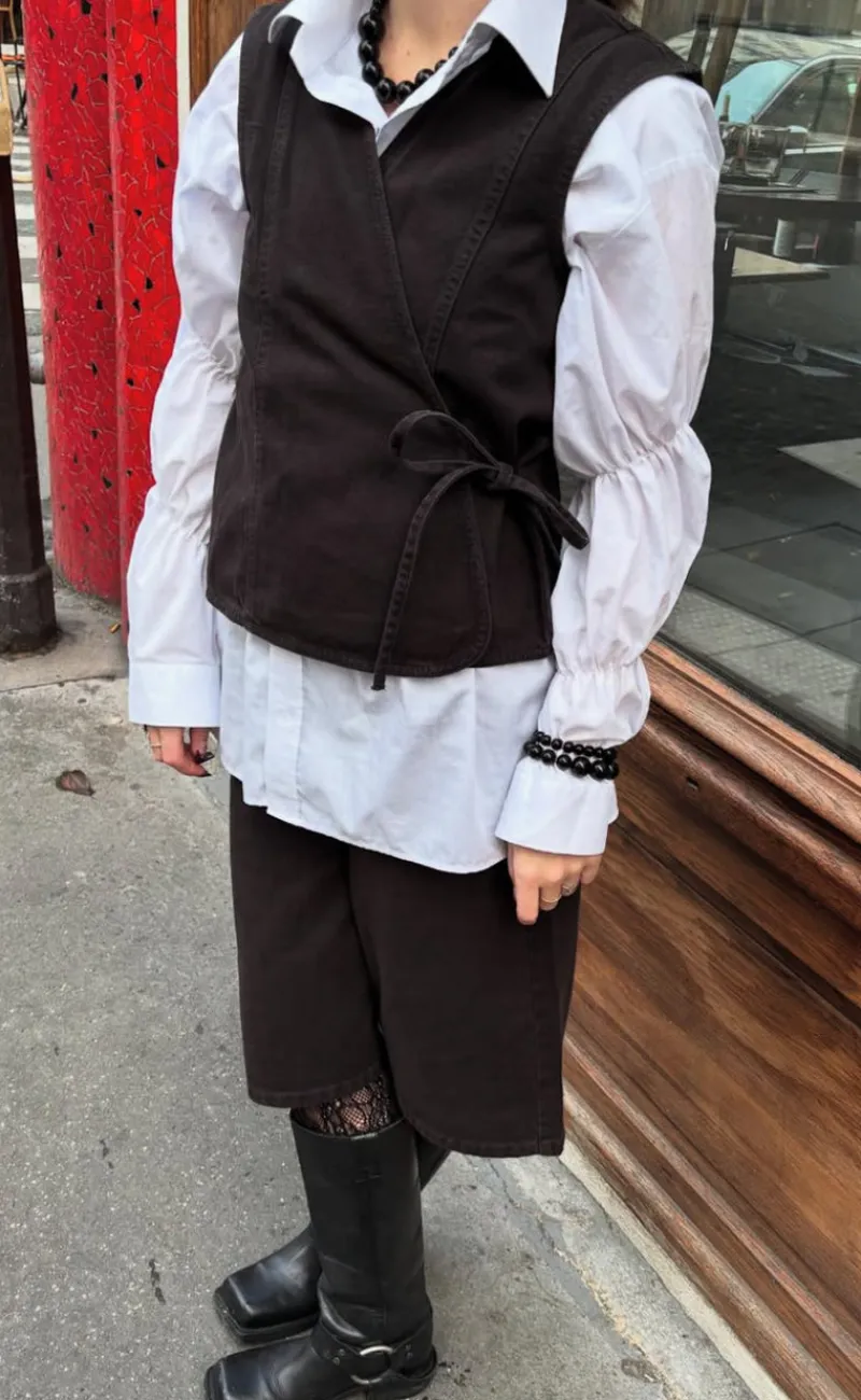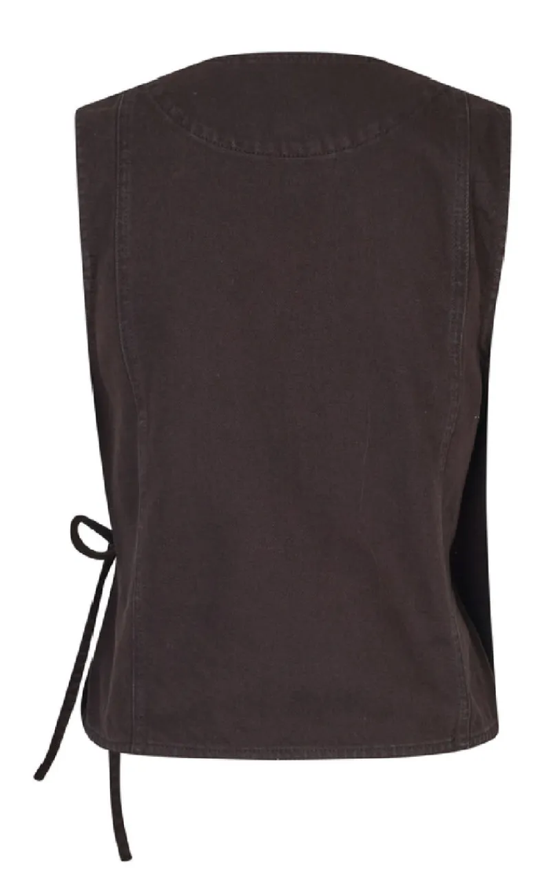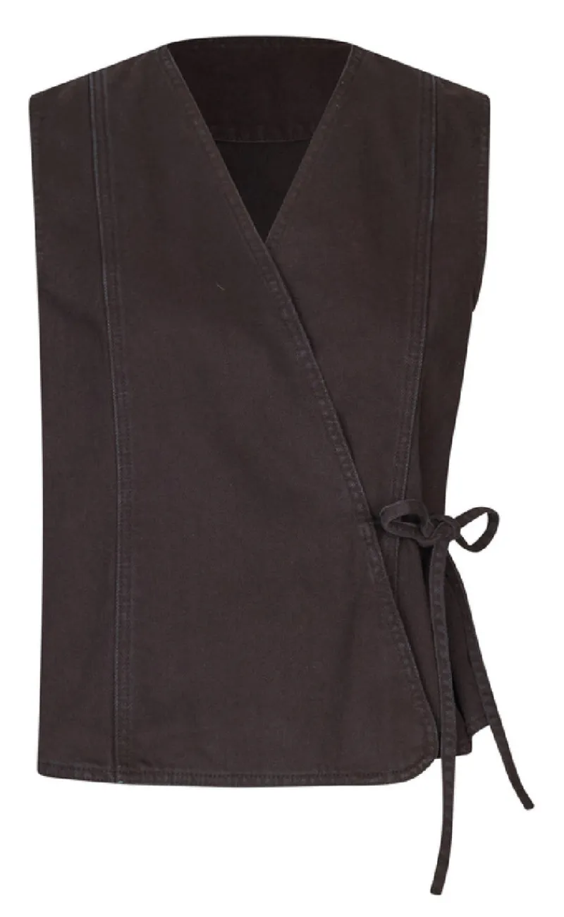 Toppen er ærmeløs, har en v-udskæring samt bindes i siden med snøre.