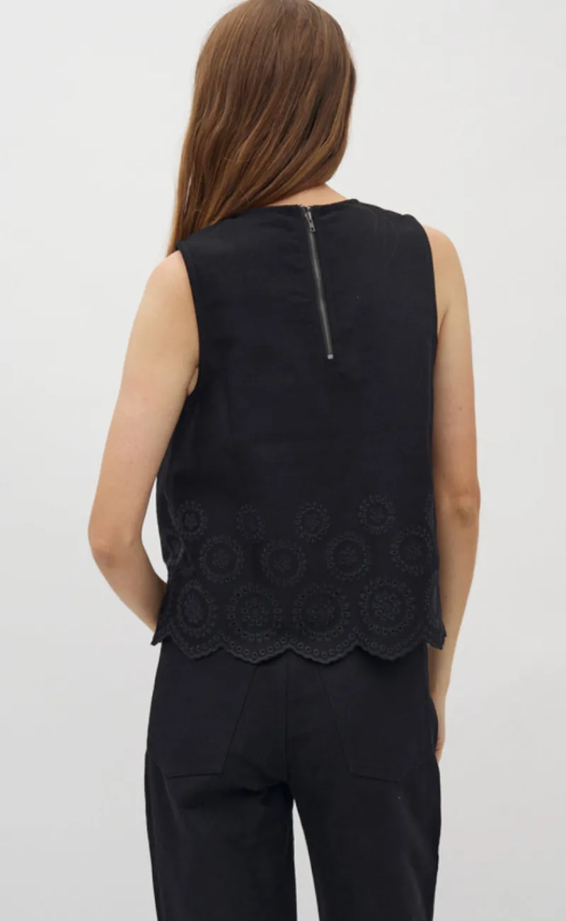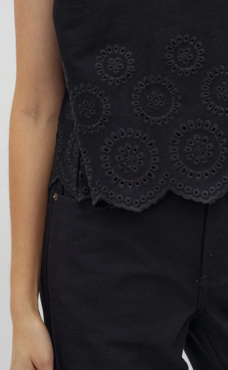 Top har korte ærmer og fine broderi detalje