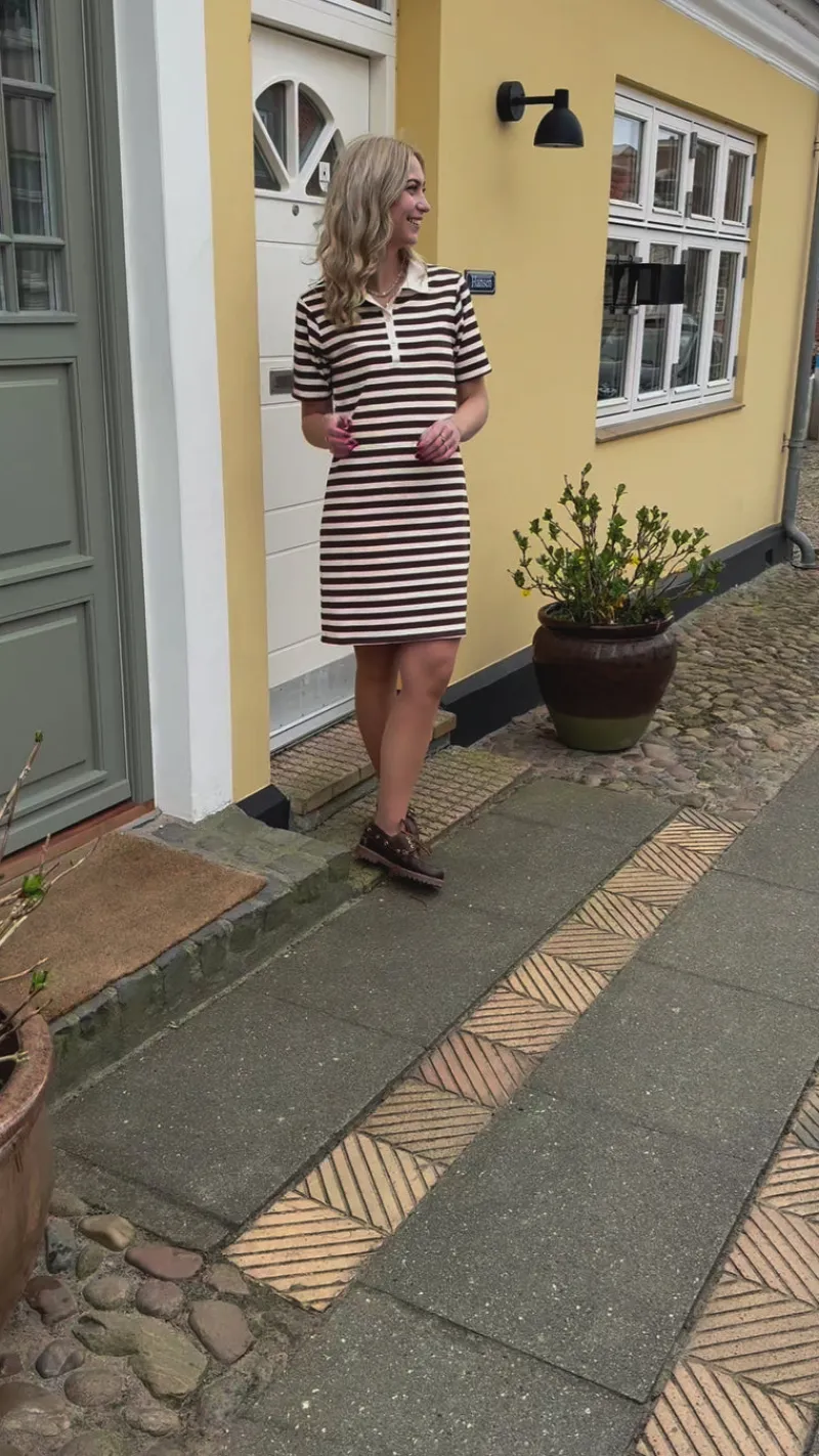 Smart polo kjole fra INA Copenhagen med striber i brun og off white.