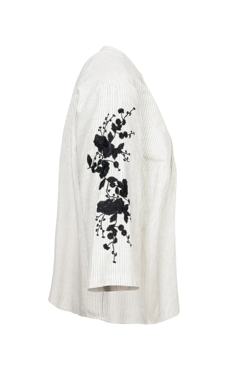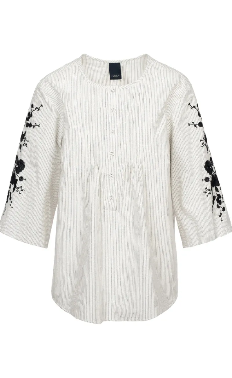 Elegant og komfortabel bluse fra Luxzuz i en creme hvid farve – med et smukt, broderet mønster på ærmerne og fine striber i stoffet.