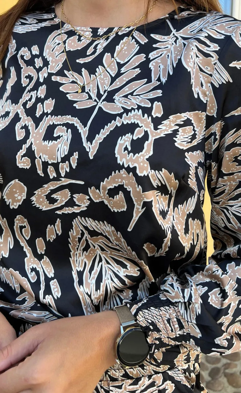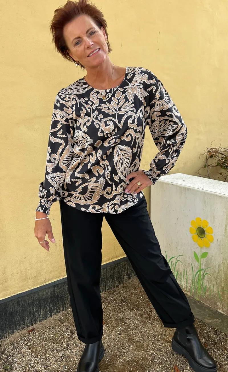 Super smuk bluse fra INA Copenhagen i sort med print af brune blade.