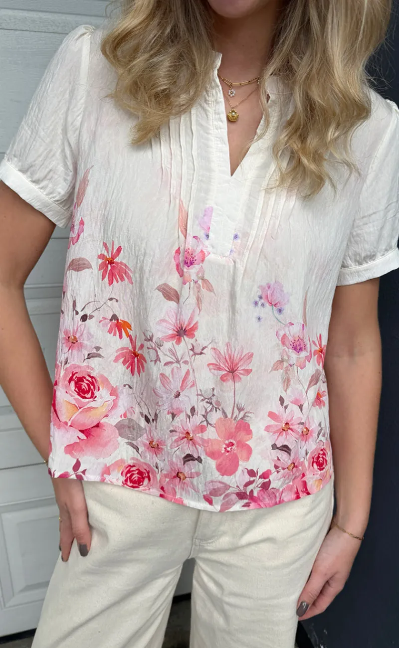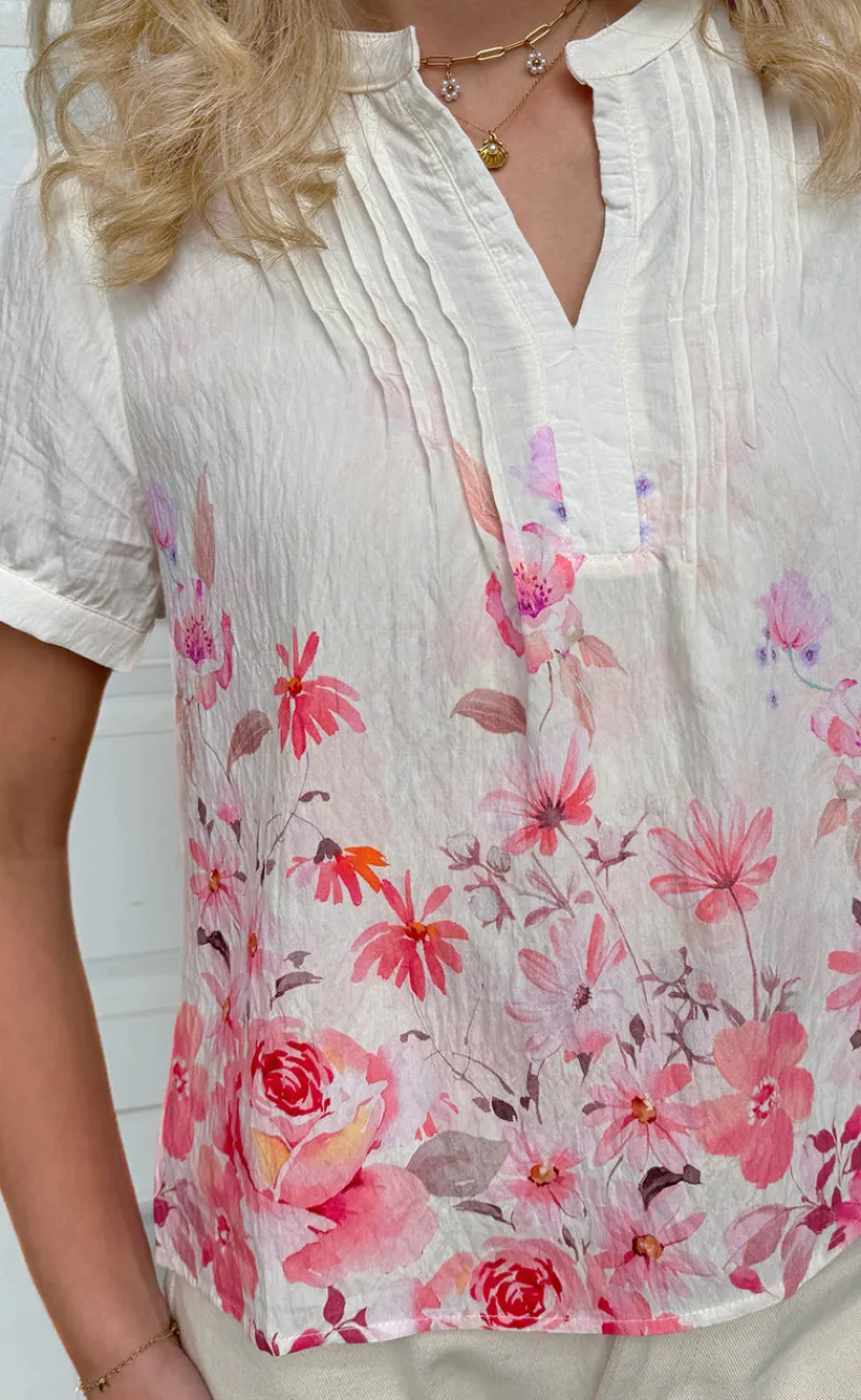 Smuk bluse fra Say INA Copenhagen i off white med det fineste blomsterprint i pinke nuancer nederst.