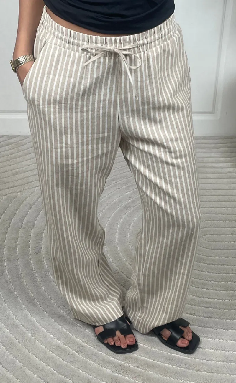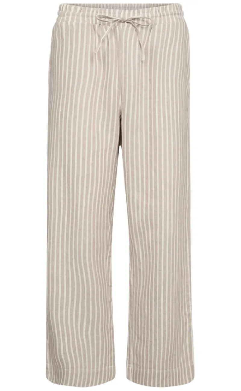 Lækre hør bukser fra Freequent i et beige stribet print.