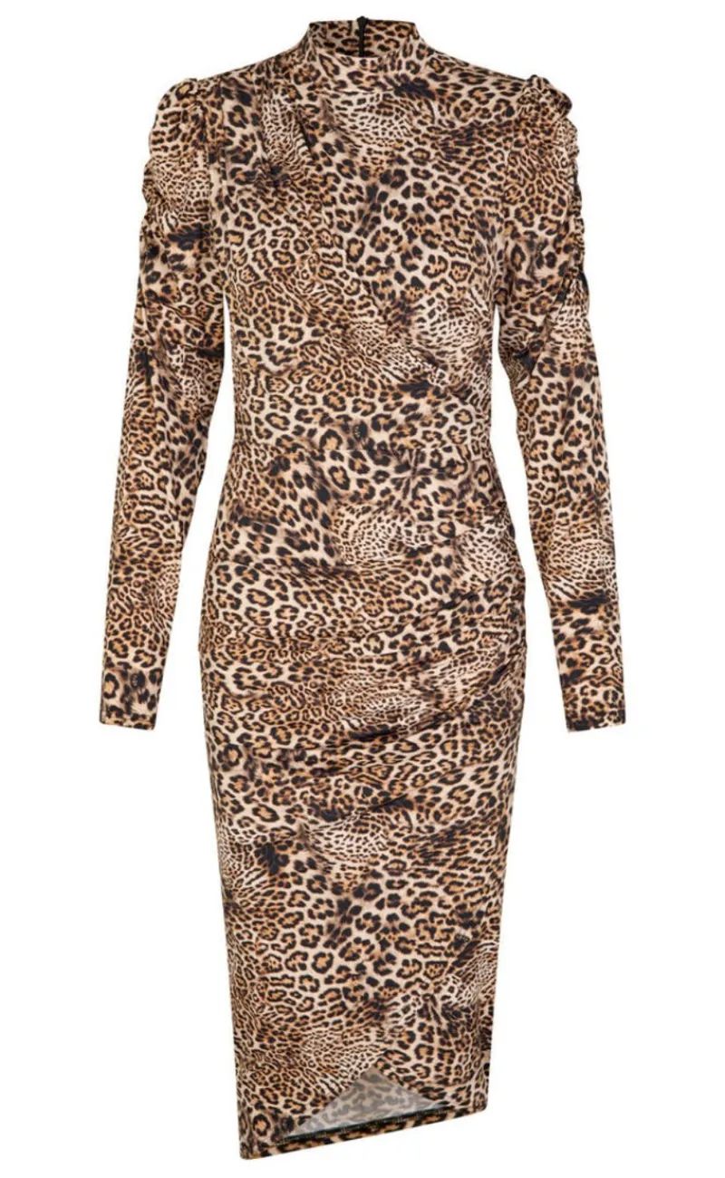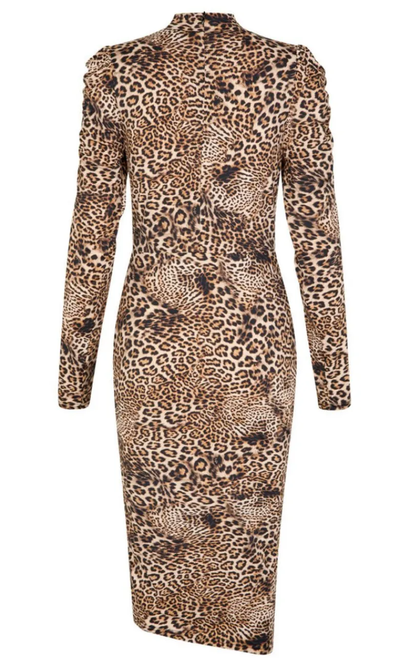 Tætsiddende kjole med lange ærmer i et cool dyreprint. Kjolen draperer smukt på udvalgte steder, hvilket giver en meget flatterende pasform. Den har en usynlig lynlås på ryggen.
