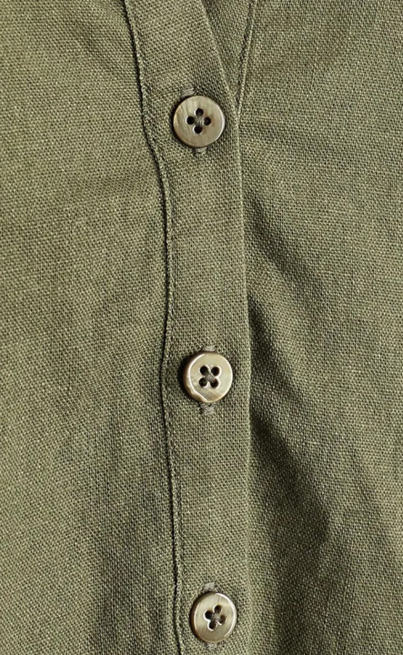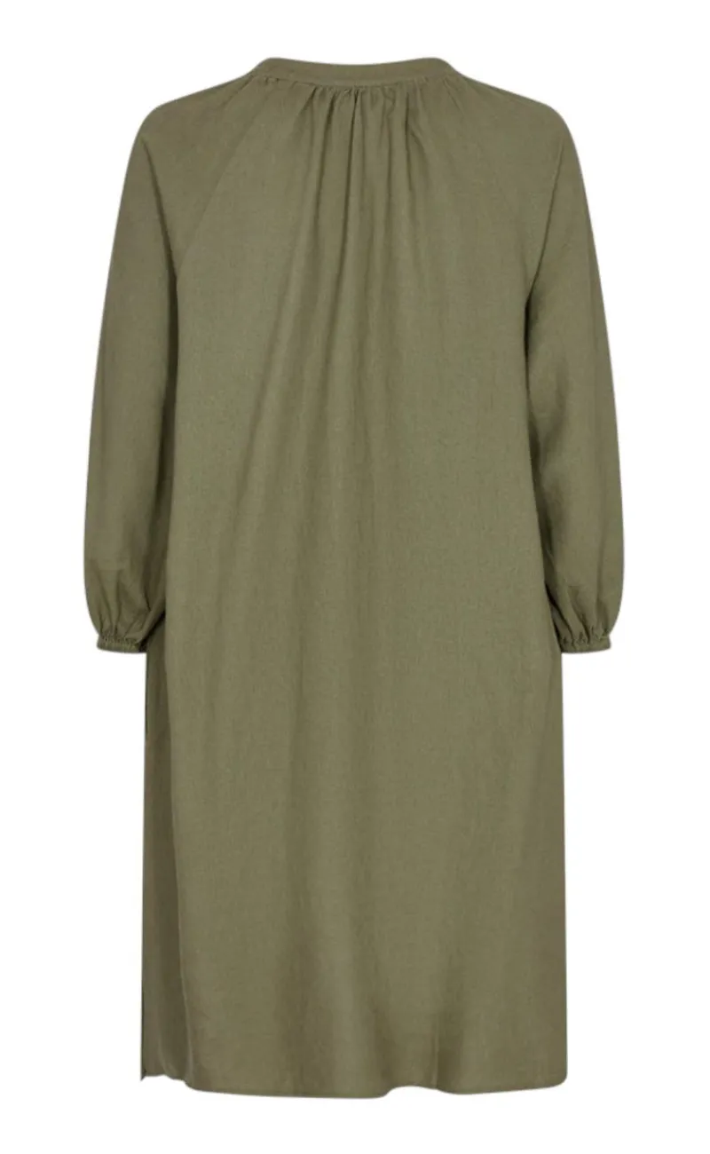 Smuk hør kjole fra Freequent i en grønlig farve.