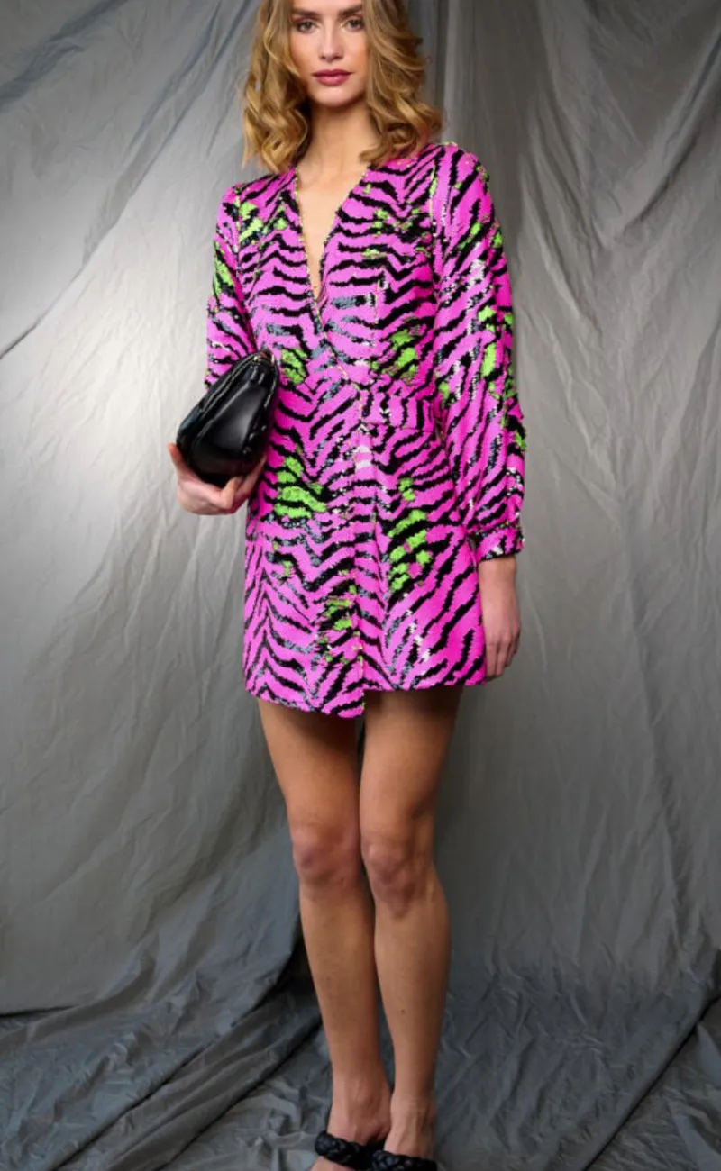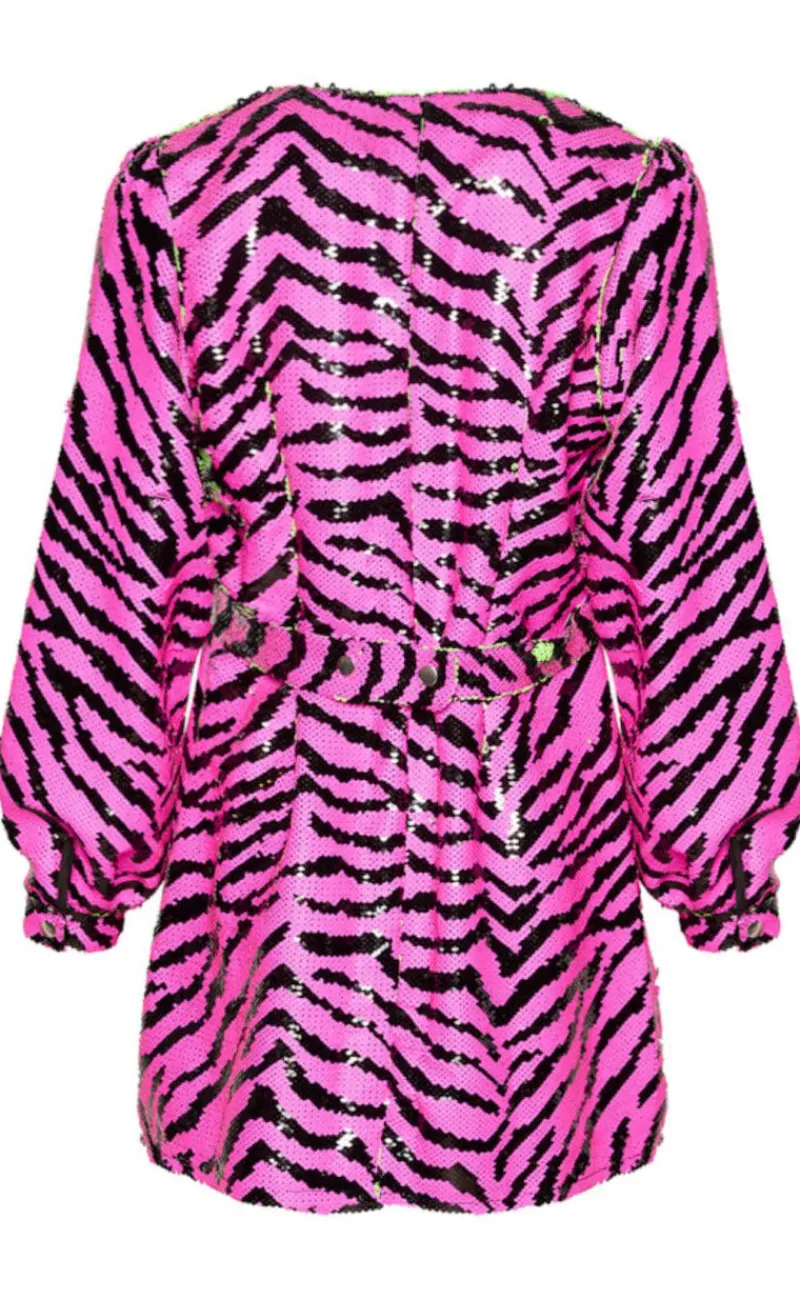 Kjolen er kort, har lange ærmer og et elastikbælte i taljen.