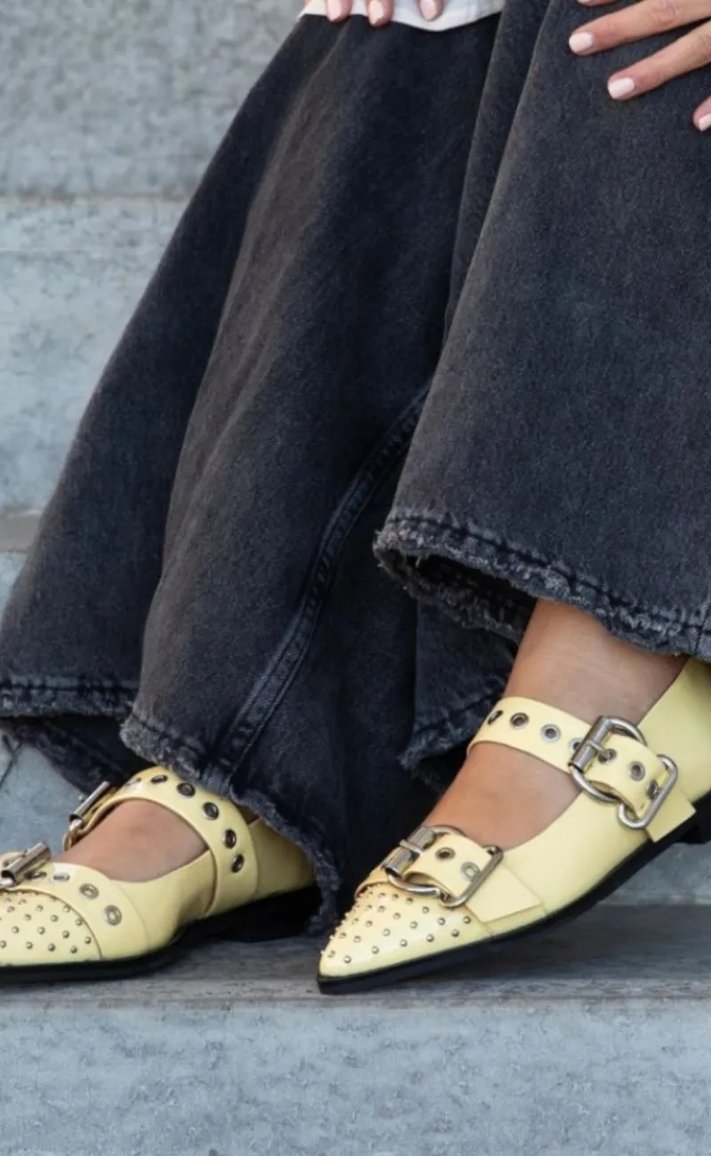 De fineste ballerinaer fra Copenhagen Shoes i gul med to spænder samt sten.