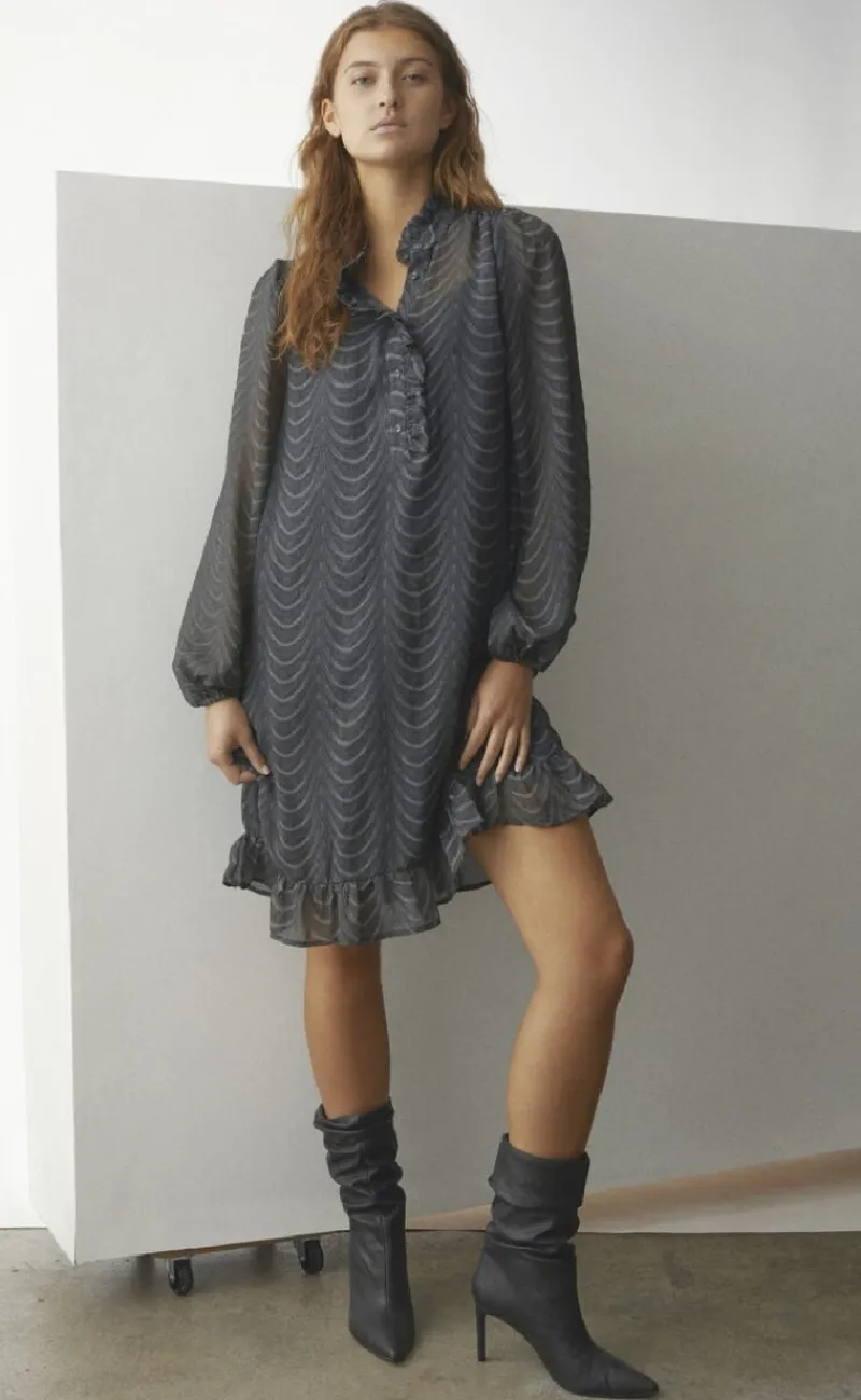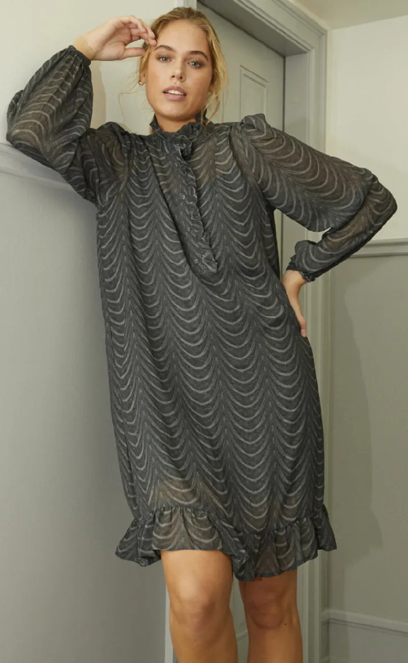 Feminin lang og løstsiddende kjole fra Love & Divine i et mørkegrå mønster.