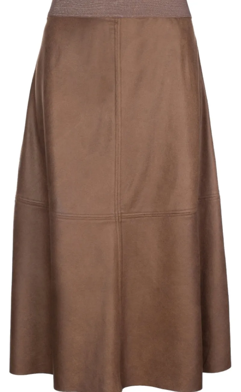Nederdelen har et bredt metallisk elastikbånd i taljen.