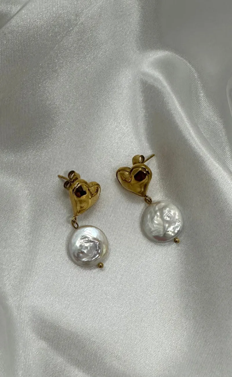 Eksklusive hænge øreringe fra Smykkeli Copenhagen med et 18k guldbelagt hjerte og en fin perle.