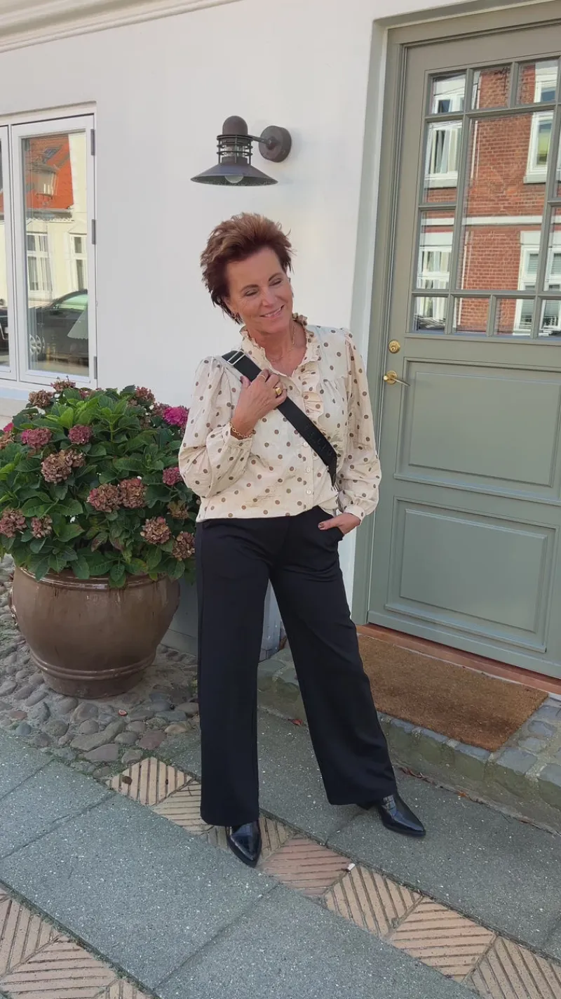 Eksklusiv bluse fra INA Copenhagen i beige med brune prikker.