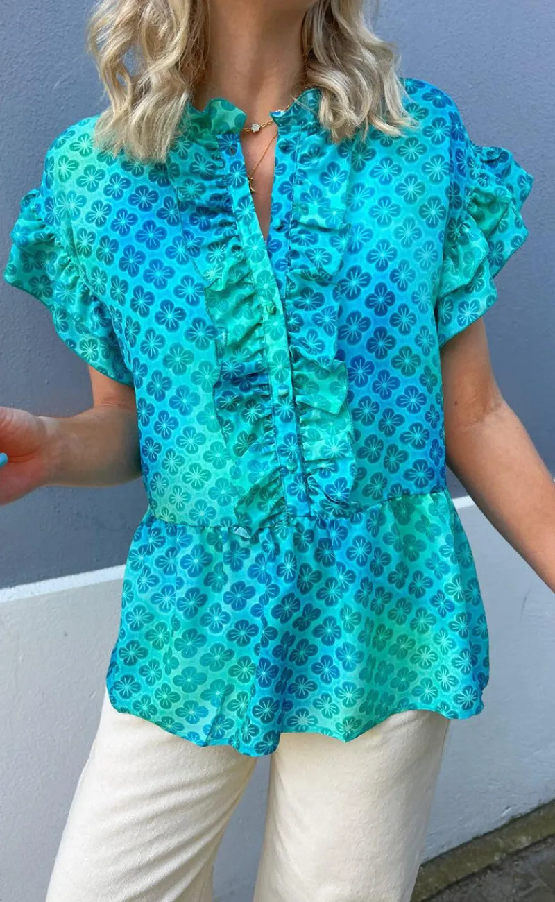 Toppen har et oversize fit, flæse-ærmer og en åbning fortil med flæser omkring.