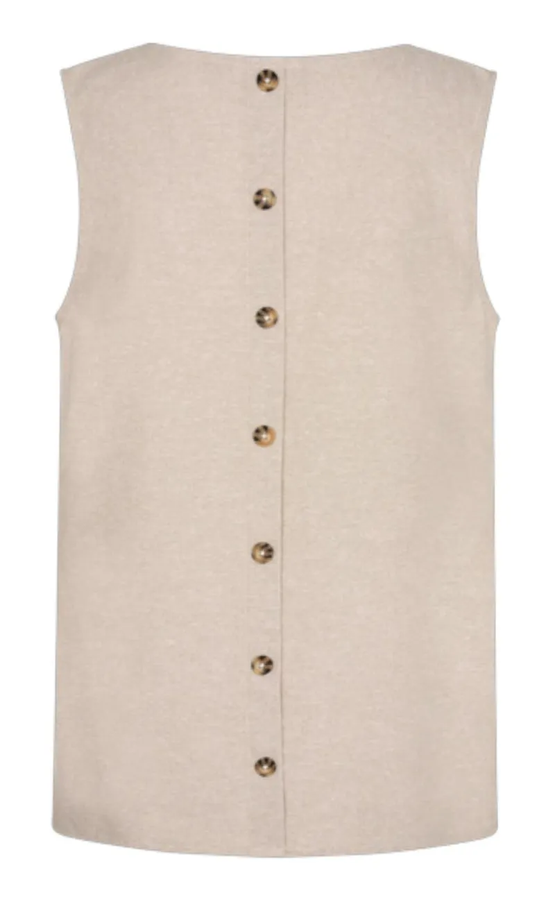 Toppen er ærmeløs og har en rund halsudskæring. Desuden har toppen knapper på ryggen.