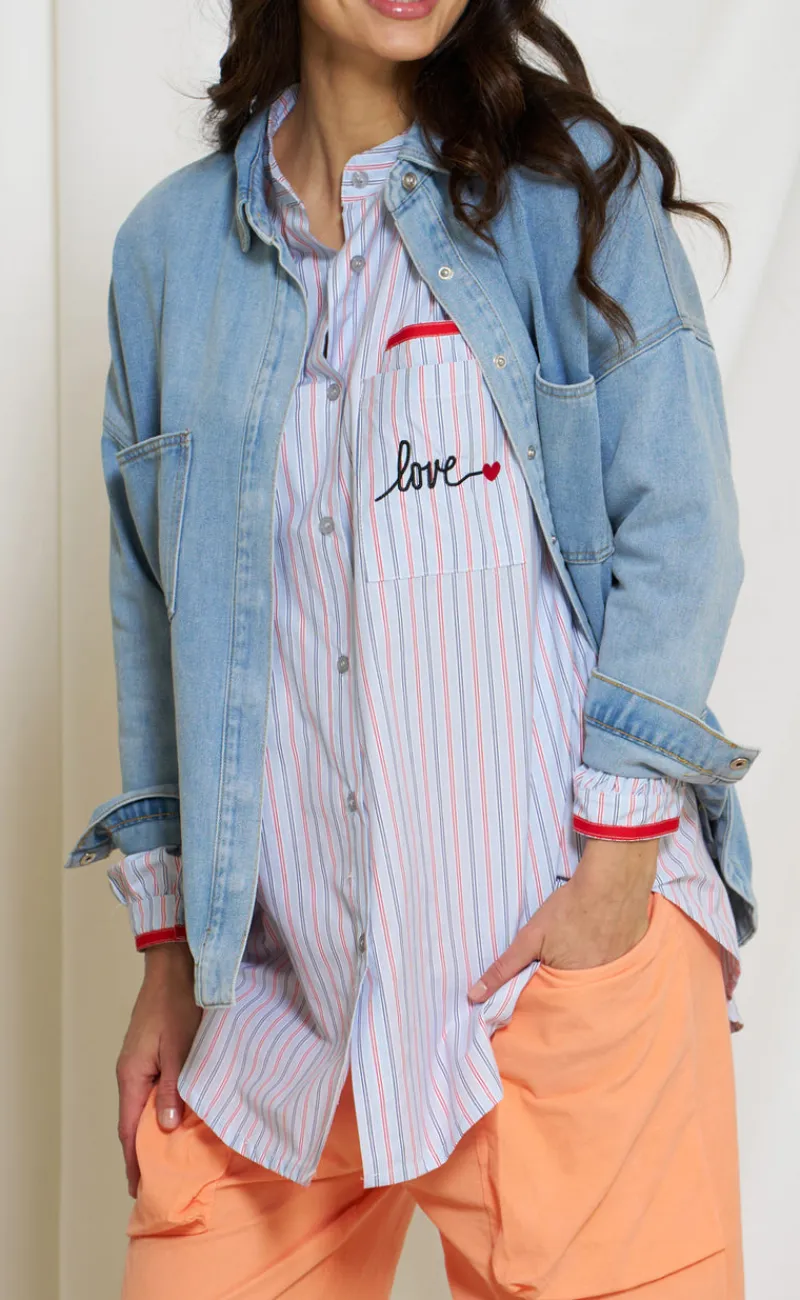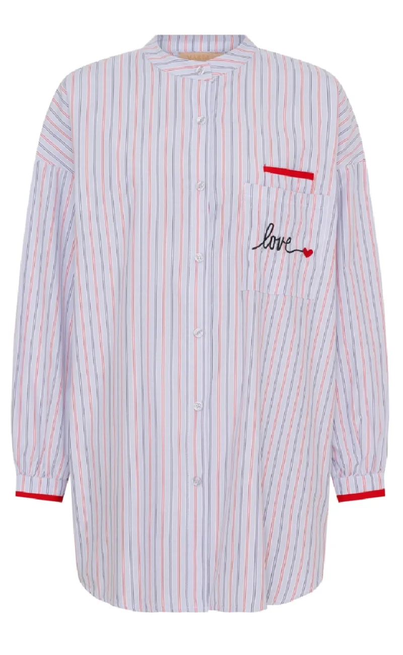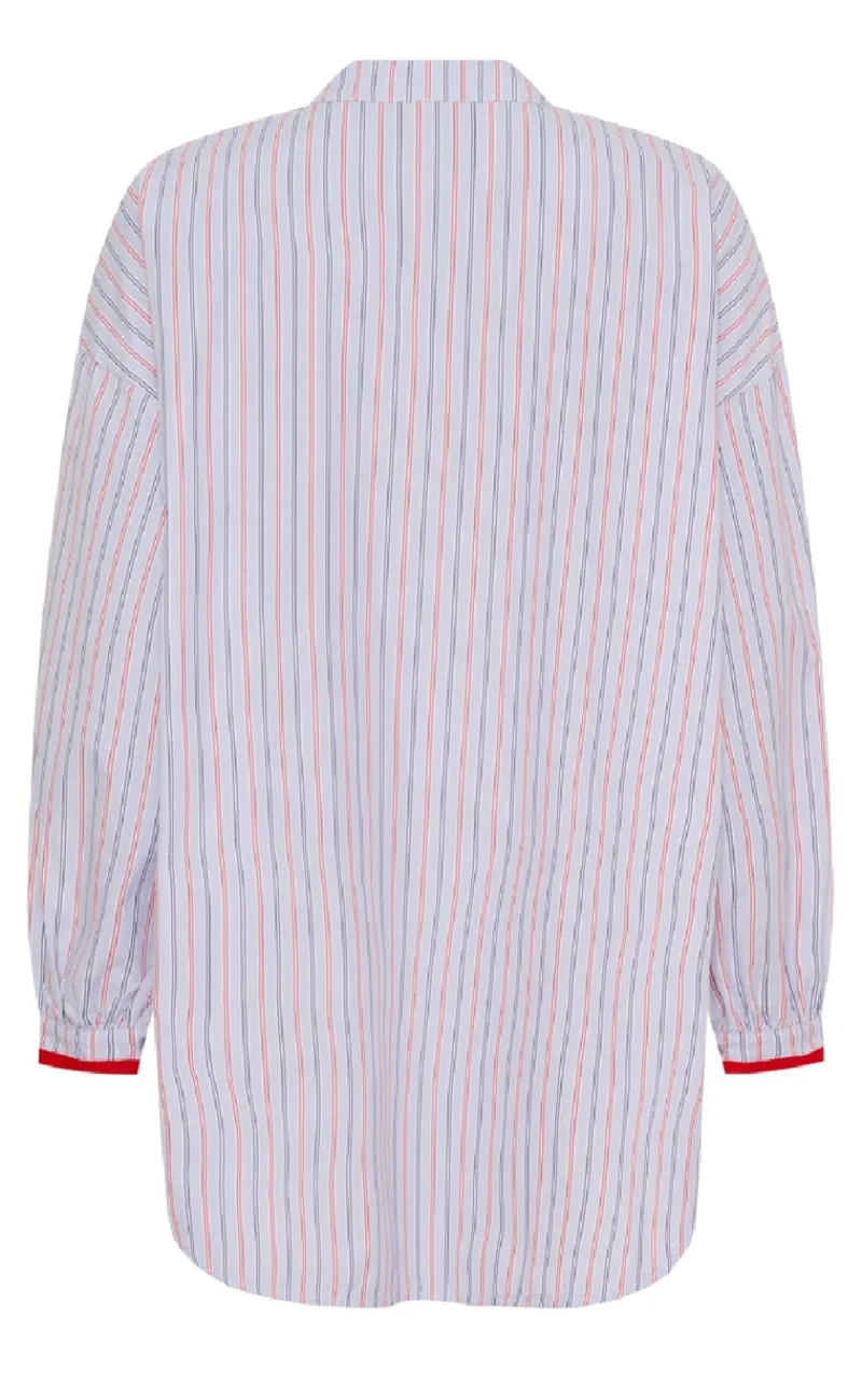Denne skjorte har striber og røde detaljer.