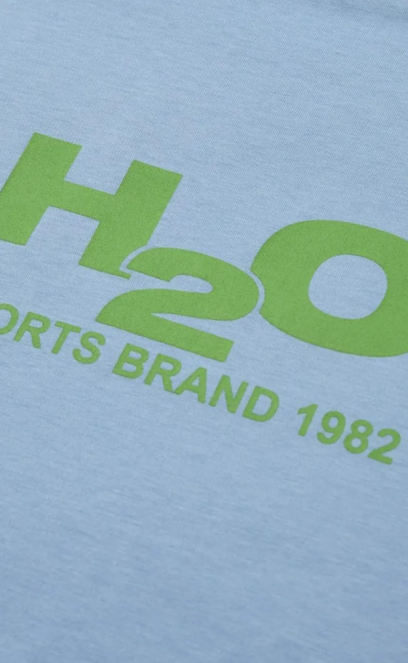 Flot og basic t-shirt fra H2O i lyseblå med det klassiske “H2O” logo fortil, i lysegrøn.