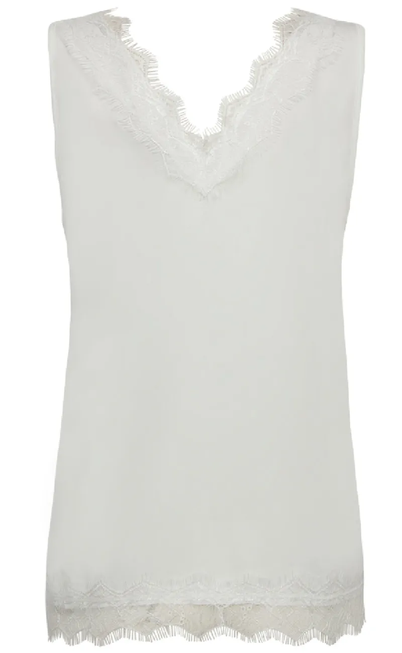 Fin top fra Freequent med brede stropper og smukke blondedetaljer, som gør toppen meget elegant.