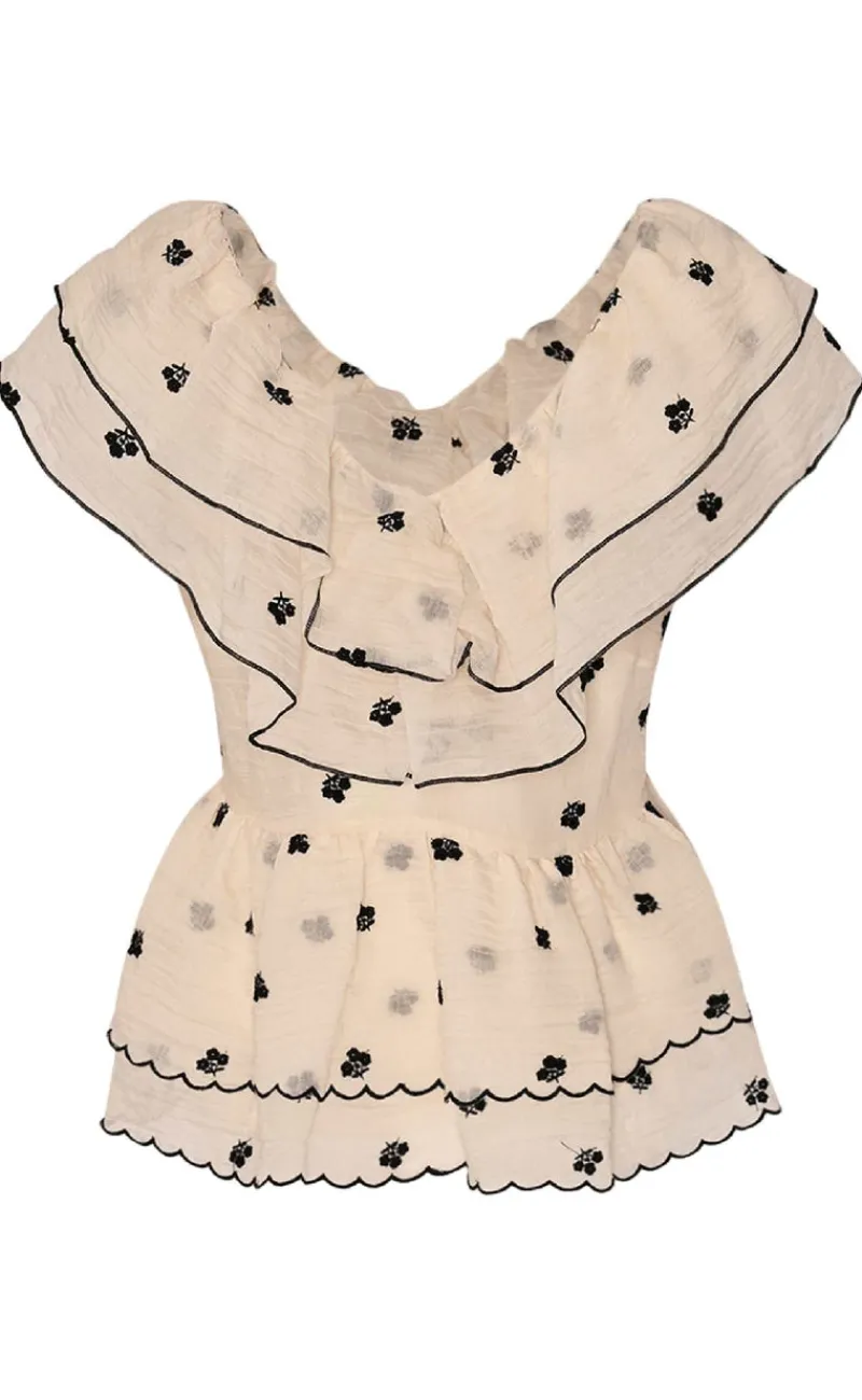 Sød top fra Noella i off white med sorte broderede detaljer.